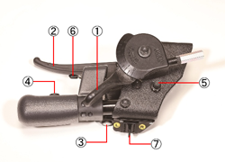● エレックとブレーキロックスイッチは手動レバー握り部前側中央にあり、同スイッチを掛けたい所で指で押します。