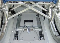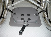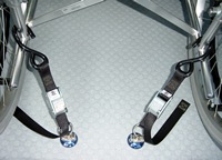 車いすの前後4ヶ所にフックを掛けるだけで固定できます。自動車走行中も自動で増し締めされます。赤いレバーを押下げると固定ベルトがフリーになり解除できます。